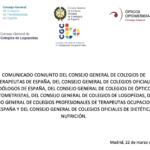 Comunicado conjunto del Consejo General de Colegios de fisioterapeutas de España, del Consejo General de Colegios Oficiales de podólogos de España, del Consejo General de Colegios de ópticos optometristas, del Consejo General de Colegios de logopedas, del Consejo General de Colegios profesionales de terapeutas ocupacionales de España y del Consejo General de Colegios Oficiales de dietética y nutrición.