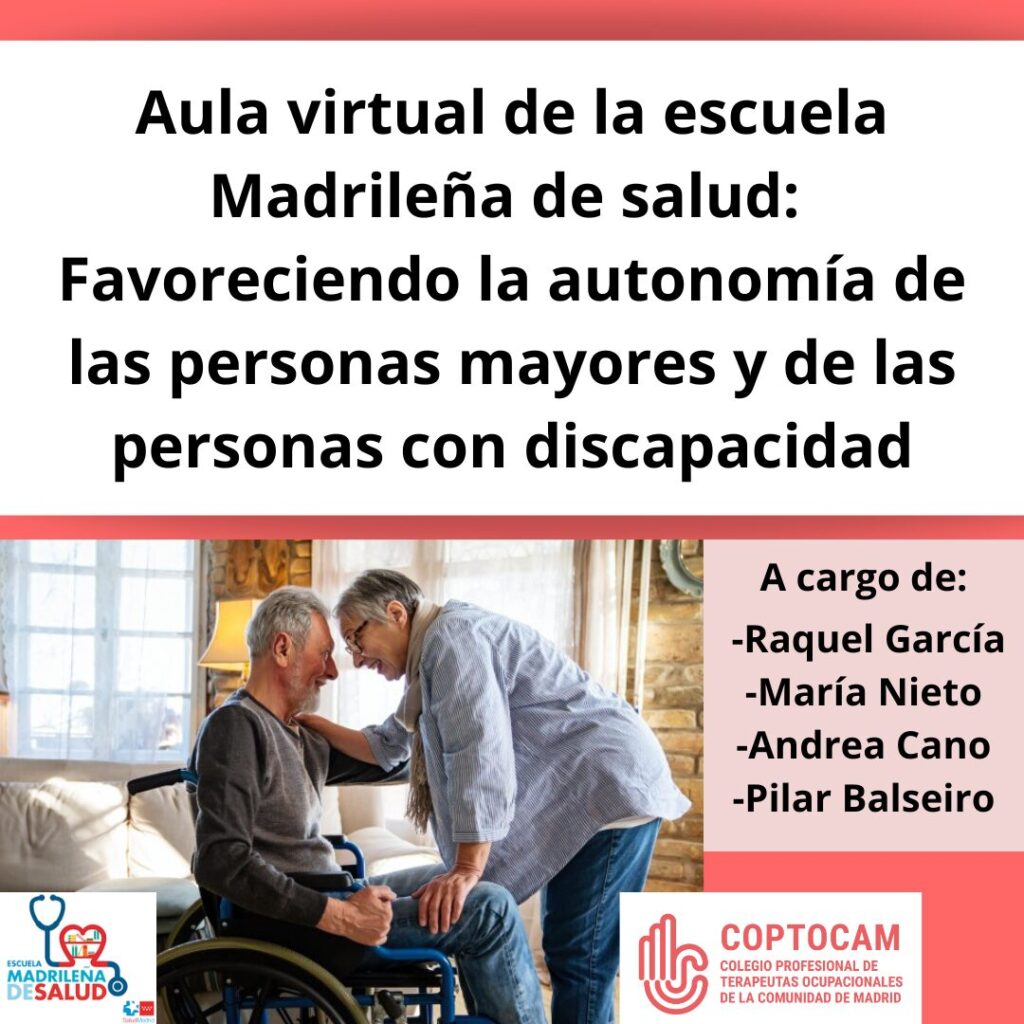 A través de la presente comunicación deseamos informaros que la Escuela Madrileña de Salud junto con COPTOCAM ha organizado una nueva sesión formativa, el martes 22 de octubre a las 13h, en su Aula virtual: Favoreciendo la autonomía de las personas mayores y de las personas con discapacidad