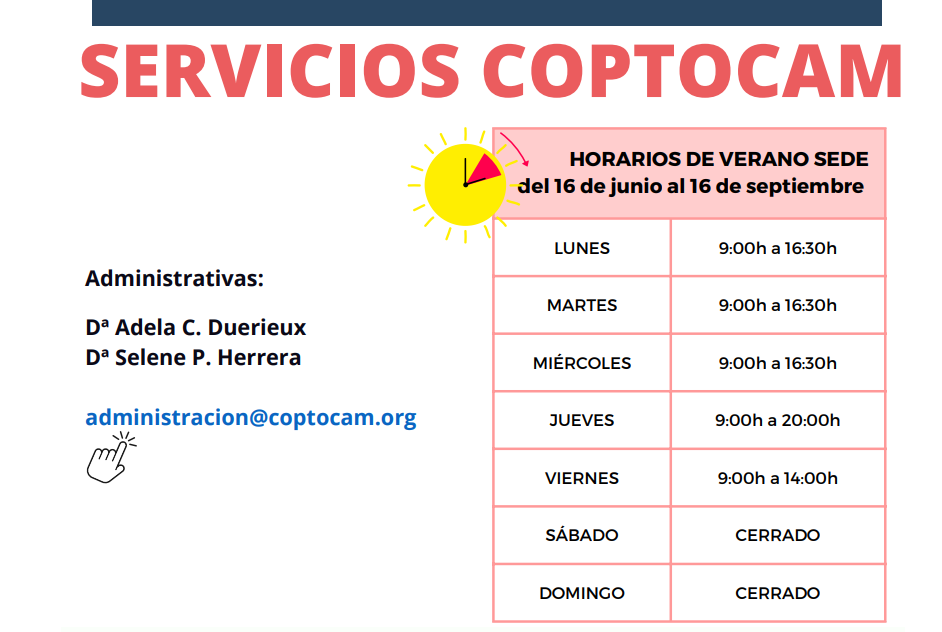 Informamos que, entre el 16 de junio y el 16 de septiembre, la sede de COPTOCAM adoptará un nuevo horario de atención coincidiendo con el periodo estival.