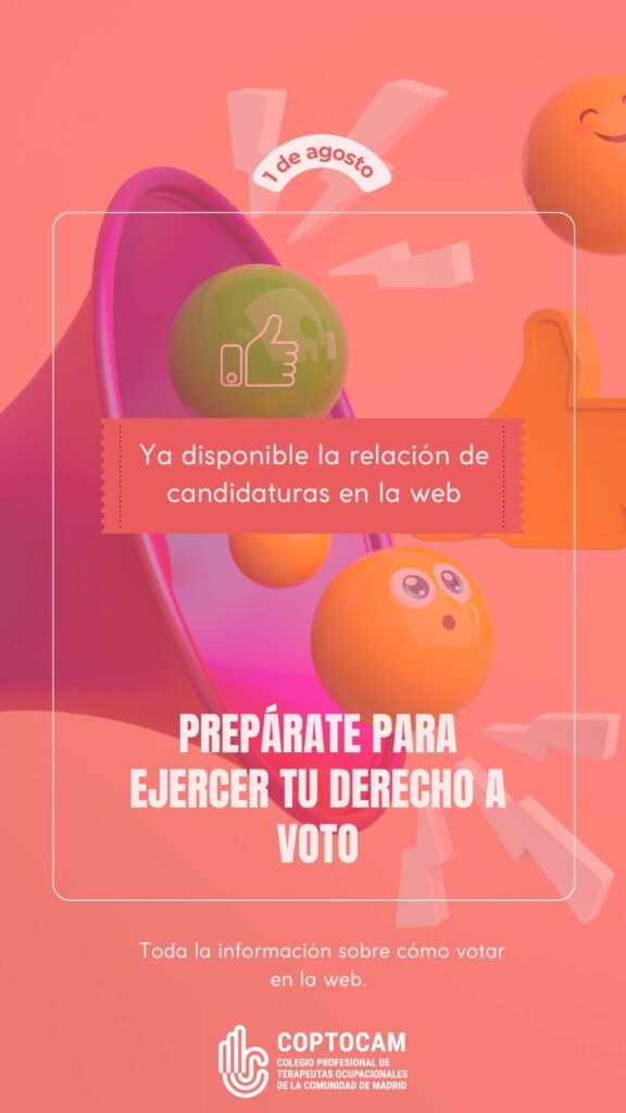 El Colegio Profesional de Terapeutas Ocupacionales de la Comunidad de Madrid (COPTOCAM) informa a todas las personas colegiadas de la publicación oficial de las candidaturas presentadas para las elecciones a la Junta de Gobierno, previstas para el próximo 30 de agosto de 2025.