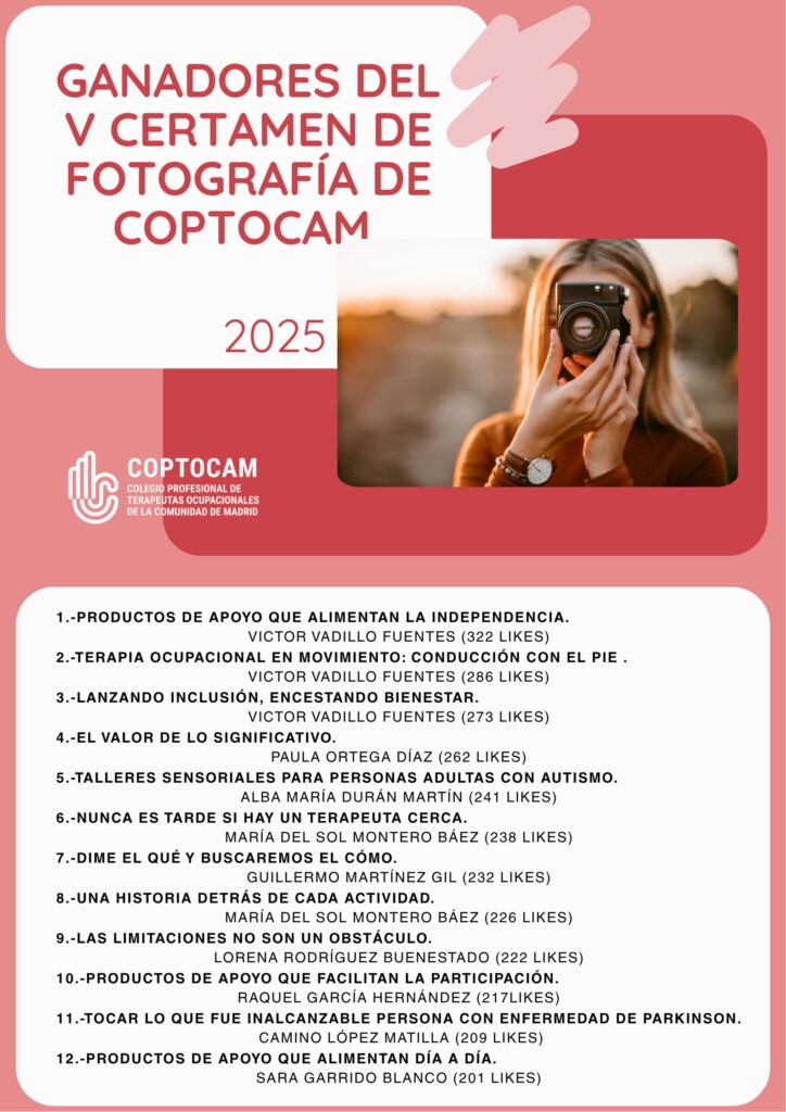 Desde COPTOCAM queremos dar las gracias a todas las personas colegiadas que han participado enviando sus fotografías, así como a quienes han contribuido con sus votos a hacer visible el trabajo de la Terapia Ocupacional a través de la imagen.